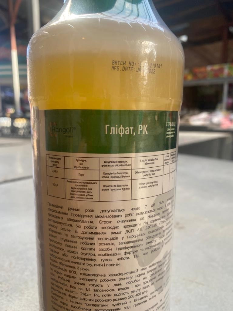 Активна речовина: Ізопропіламінна сіль гліфосу, 480 г/л Препаративна форма: Водний розчин Гербіцид і Десікант сільськогосподарських культур. Механізм дії: Ізопропіламінна сіль гліфостату — активна речовина гербіциду Гліфат, 48% в.р. — за допомогою дії на рослину належить до групи інгібіторів синтезу амінокислот. Проникає в рослину через її активні зелені надземні частини. Завдяки системним властивостям за короткий період часу потрапляє в усі життєво важливі органи рослини (наземні та кореневої системи), порушує синтез необхідних для росту й розвитку амінокислот. Викликає швидке припинення росту, хлороз молодого листя, відмирання надземних і підземних органів. Спектр дії: Препарат згубно діє на надземну та кореневу частину однорічних і багаторічних дводольних, злакових бур'янів. Звільняє поле від бур'янів для наступних культур у перерізі та полегшує прибирання врожаю. Застосування гербіциду Гліфат, 48% в.р. для десикації сприяє фізіологічному дозріванню насіння впродовж 8-11 днів, завдяки чому втрати від його висипання мінімальні. Технологія застосування: